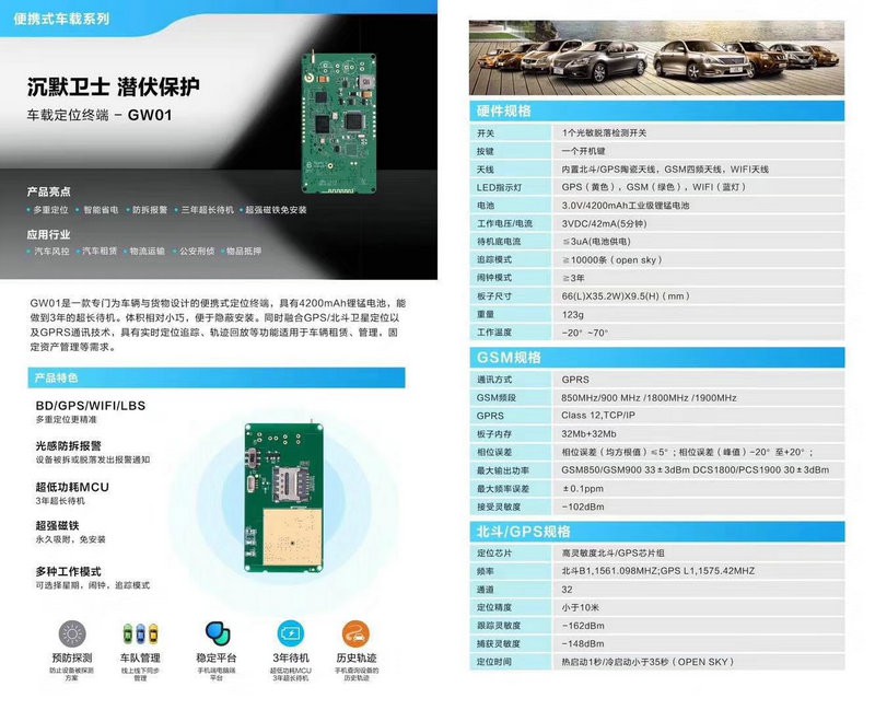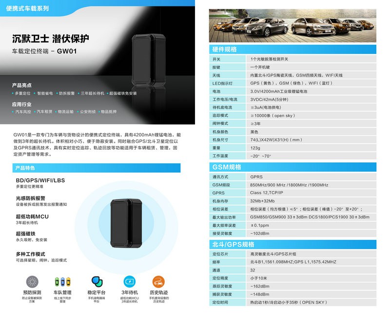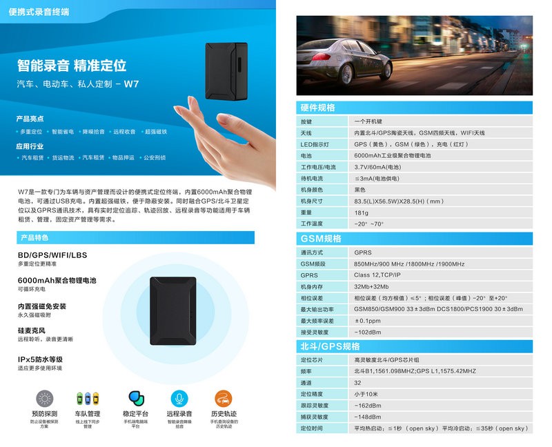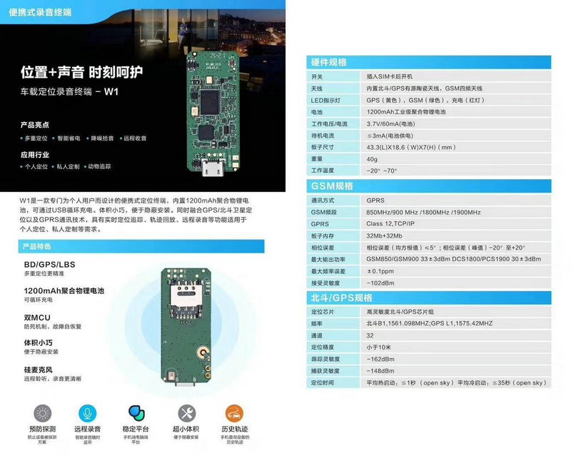 W1是一-款專門為個人用戶而設計的便攜式定位終端,內(nèi)置1200mAh聚合物鋰電池,可通過USB循環(huán)充電。體積小巧,便于隱蔽安裝。同時融合GPS/北斗衛(wèi)星定位以及GPRS通訊技術,具有實時定位追蹤、軌跡回放、遠程錄音等功能適用于個人定位、私人定制等需求。